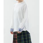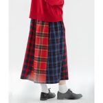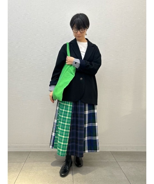 4種類のチェックを組み合わせた6枚はぎのスカートを主役にジャケットスタイルでコーディネート。 インナーにシンプルなカットソーを合わせることで普段のお出かけから、保護者会など幅広いシーンで活躍します。