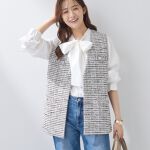 華やかさと上品さを兼ね備えたツイードジレ&ボウタイブラウスは、忙しいシーンをスマートに演出する理想的なアイテムです。ミックスツイードのジレは、柔らかく馴染みやすいジャージ素材。さまざまなフォーマルシーンに大活躍間違いなしのセットアップです!
