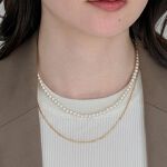 濃い色シャツにデコラティブなパールを添えて、洗練された大人のカジュアルコーデ。耳元で弾むパールが横顔を印象的に演出し、手元には煌めきが揺れるビジューブレスレット。2連の程よいボリュームのパールネックレスが全体をまとめ、どこから見ても隙のないレディな装いに。
