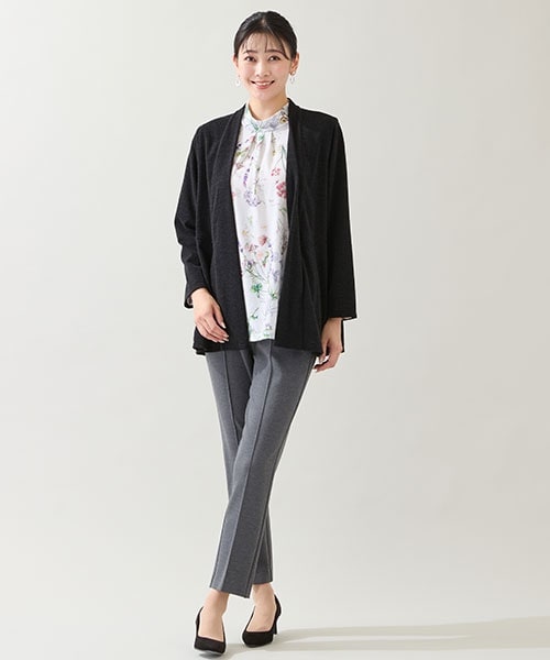 【大きいサイズ】花柄のカットソーが甘さを添えてくれるパンツスタイル。黒のカーディガンを羽織れば着やせ効果アップ◎