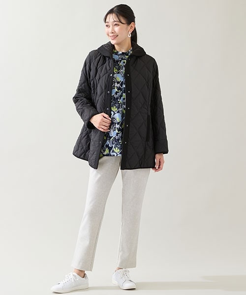 【大きいサイズ】軽くて暖かいキルトアウターにポップな柄インナーを合わせた大人のカジュアルコーデ