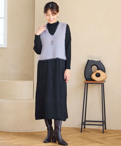 ベストとワンピースがセットになったお得なアイテムがこちら。単品でも着まわせるので冬のお出かけシーンに重宝しそう!