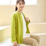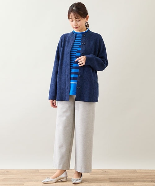 ニットカーディガンとセーターのブルーをリンクさせたパンツコーデ。足元を淡色にすることでスッキリと着こなせます。