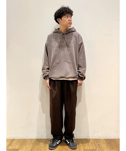 【着用サイズ パーカー:L パンツ:M】ヴィンテージ調のスノーウォッシュ加工が施されたフードパーカー。ゆるっとしたリラクシーなシルエットで、スラックスやデニムなどあらゆるボトムと好相性◎
