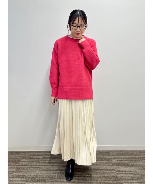 ふわふわもっちりなニットは肌ざわりがやわらかで、チクチク感なく着られます。ゆったりしたシルエットで着心地◎丈は腰辺りまできますが、サイドスリットのおかげで横のシルエットもすっきり。スエード風の素材で季節感のあるプリーツスカートは、動いた時のプリーツの広がりもきれいです。