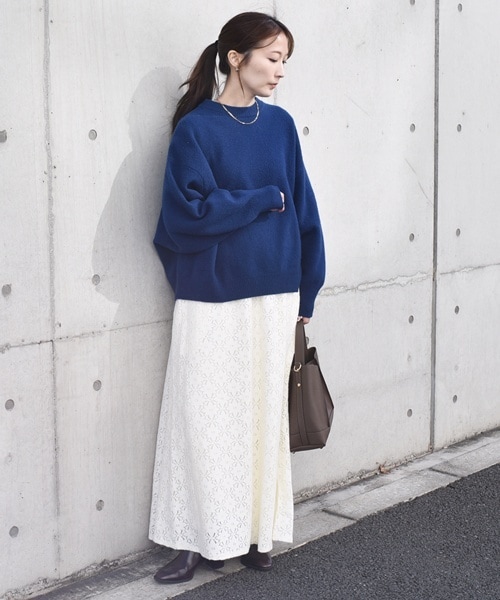 普段サイズ:36 骨格:ウェーブ パーソナルカラー:ブルべ冬 ニットに、起毛感のあるスカートを合わせたふんわりとした素材感がポイントのコーデ。