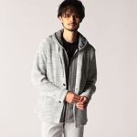 変形ワッフル編みメランジカラーがオシャレなカットジャケットでのコーデ。 ソフトな生地感で、シャツやカーディガン感覚で羽織れるアイテム。幅広いコーデで合わせられる一着です。