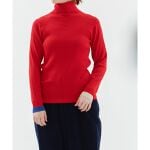 春秋のジャケットや軽い羽織りにも便利なフォーマル生地を使用したポケットブルゾンに薄手でチクチクしにくいタートルニットを着用ボトムは丸くボリュームのあるフルレングスのパンツを合わせ大人カジュアルな印象に。レッドのインナーががアクセントに!