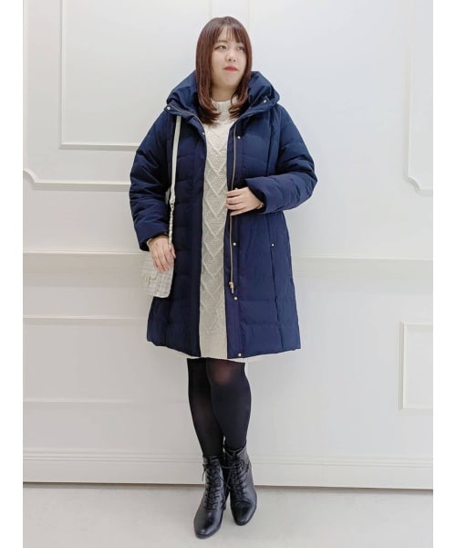 ロングダウンは、ダウン70%フェザー30%で軽いのにあたたかい着心地が人気のアイテム! 緩やかに入ったダーツがすっきりと着痩せて見えます♪ 中にはニットワンピースを合わせてみました! 柔らかなモール素材のニットはキラキラのラメ入り!1枚で着ても着映えるアイテムです!