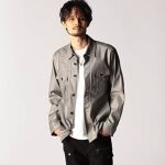 CPOシャツデザインをベースにしたシャツブルゾンでのコーデ。 麻混ストレッチ素材にコーティング加工を施した艶感が特徴です。 軽い羽織としてもミドルインナーとしても重宝するアイテムです。