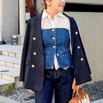 スカーフをアクセントにした綺麗目カジュアルコーデ。 紺ブレにデニムのコーデですが、スウェットとをインナーに着てバッグやパンプスできちんと見えバランスを。