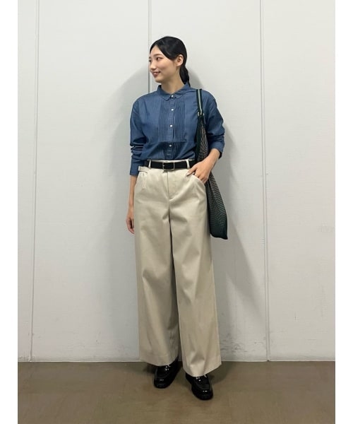 柔らかい肌触りのデニムブラウスです。程よいゆとりもありますがスッキリと見えます。ピンタックデザインがおしゃれで、春に1枚で着るのがおすすめです。冬はニットとのレイヤードもして頂けます。