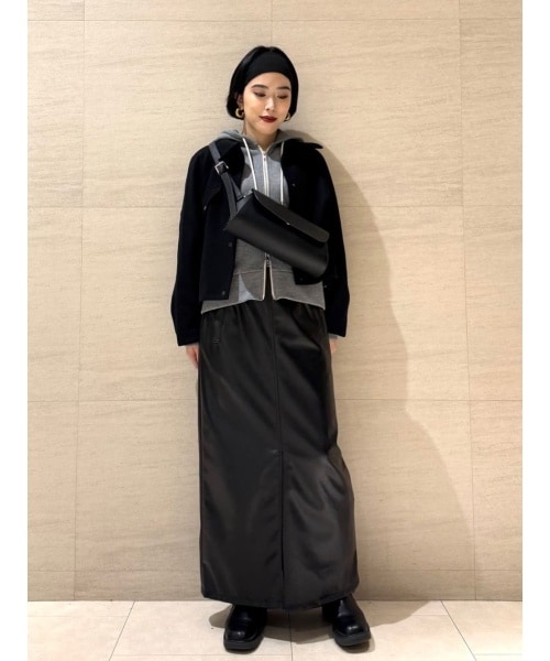 モノトーンでシックな大人カジュアルなコーディネートです。 ショートブルゾンとロングスカートでバランス良くまとめました。