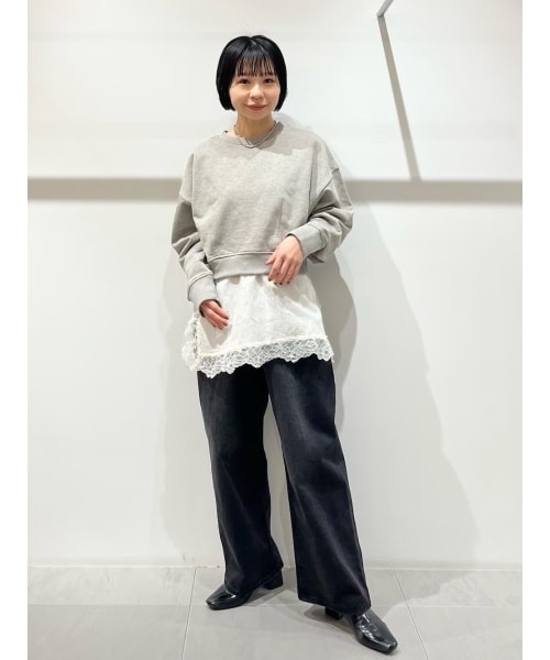 シルエットが可愛いスウェットです!裾はすっきりしています。レースのキャミはスリットが入っておりなんでも合わせられます!