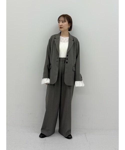 袖には取り外し可能なフリルが付いたジャケット。 シンプルなデザインなので サラリと使いやすいアイテムです◎ セットアップでモードな中に レースを入れたのもポイント。