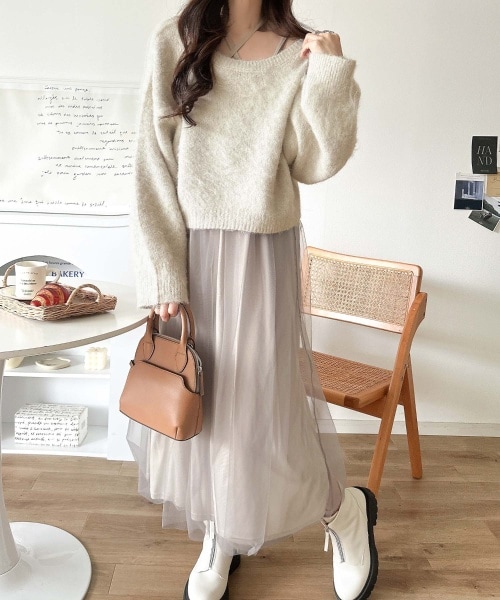 2026SS新色追加! ニットとチュールのコンビネーションが特徴的なワンピースセット。 ニットは軽くて暖かみがあり、チュールは繊細で落ち感あり◎