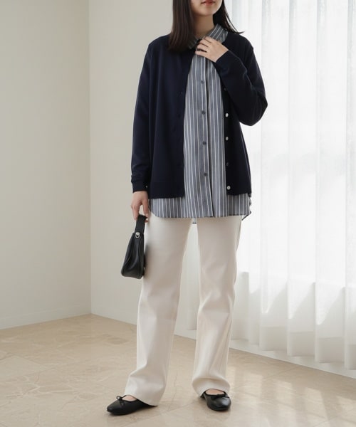 ストライプシャツと明るいホワイトデニムを合わせた春のシンプルキレカジ。ベーシックなカーディガンをゆるく羽織り、ラフなワンマイル仕様に。清潔感ある配色で上品に見え、着回しやすさも抜群。小物で雰囲気を変えて休日の外出にも最適です。