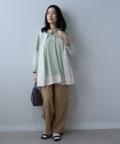 女性らしさを添えたミニタリーコートに、コード刺繍スウェットとトレンドのレースプルオーバーを重ねた抜け感あるレイヤードコーデ。スリット切替えのデニムパンツでリラクシーな動きやすさをキープし、春先のラフカジュアルを上品に仕上げる大人のカジュアルスタイル。