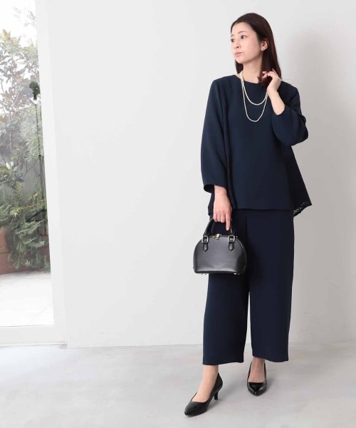 ペプラム切替えで後ろレースのブラウスとワイドパンツを合わせたセットアップ。清潔感ある色味で上品にまとまり、春先のきれいめフェミニンな装いに。落ち感素材が抜け感と着心地を両立し、オフィスからちょっとしたかしこまった席まで幅広く活躍します。