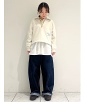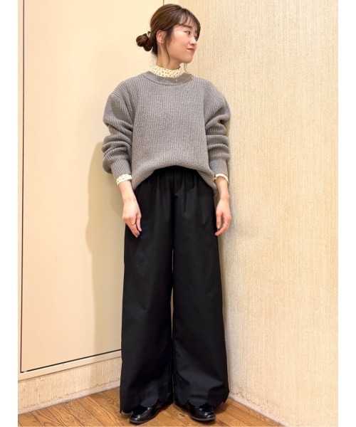 さりげないラメ感で上品な雰囲気で着ていただける2wayニットに裾スカラップが可愛いパンツを合わせたコーディネート。キレイ目な印象だけど程よく甘さを残したスタイリングです。