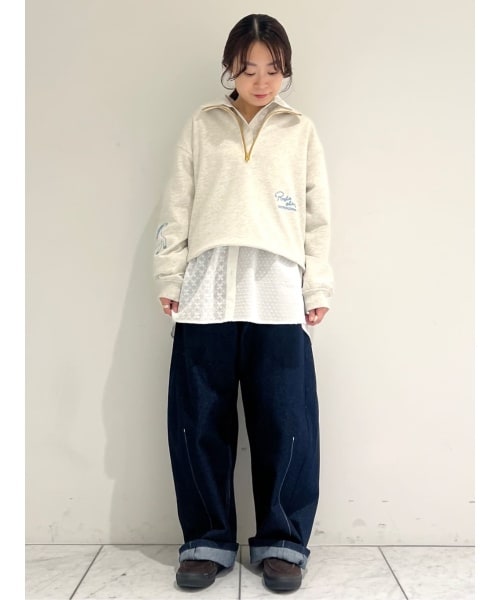 手書き風の刺繍が可愛い裏毛のハーフジッププルオーバーにトレンドのバレルパンツを合わせたコーディネート。トップスの丈感が短めなのでシャツなどと重ねてレイヤードスタイルをお楽しみいただけます。
