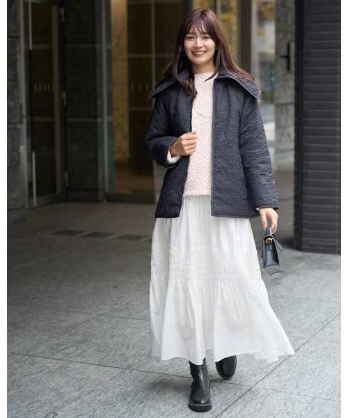 季節の変わり目に活躍するキルティングジャケットを主役に。 軽やかなスカートを合わせて、重くなりすぎない大人の春先コーデに仕上げました。