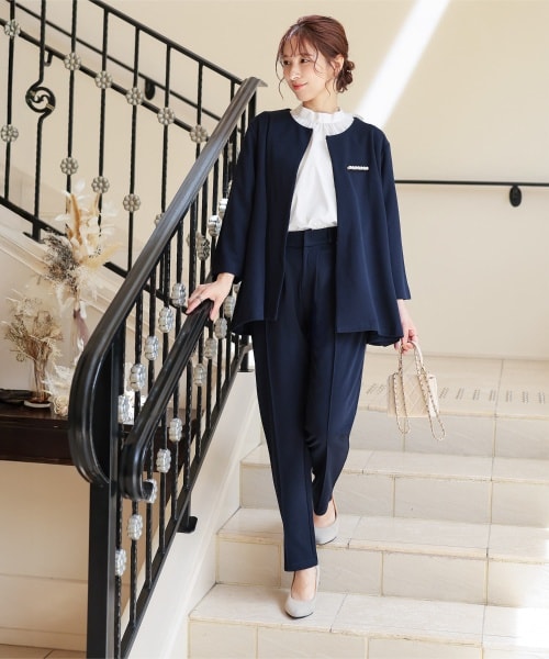ノーカラーのジャケットで首元がすっきり見えて上品なセレモニーセットアップ。