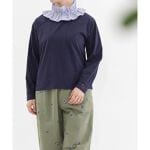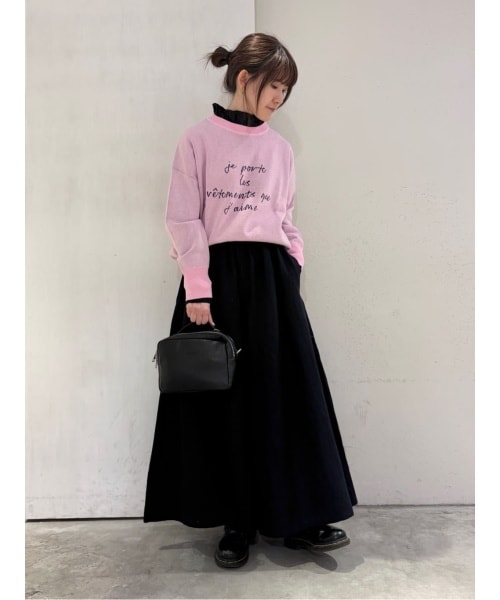 ピンク×ブラックコーディネート。 綿100%の分厚すぎないニットに万能なフリル衿カットソーを合わせました。ボトムは、起毛リネンのフレアーマキシパンツ。コーディネートがおしゃれに決まる万能ボトムです。