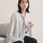 柔らかい着心地のラメ入りジャケットはタイトすぎずちょうど良いサイズ感!ジョーゼットの肌触りの良い素材のブラウス。丈は後ろが長めのゆったりシルエット。すっきりシルエットのパンツはストレッチ性もあり履き心地も抜群!同素材のジャケットを合わせてスーツとしても◎
