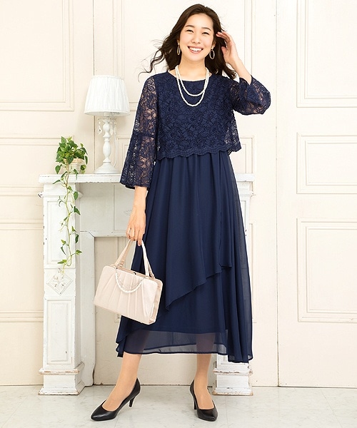 シフォン × レースのドレス1着で様になる、長袖レースと揺れる巻きスカートが上品で印象的。羽織ものも不要で結婚式にピッタリ。七五三やお宮参り等の記念日にもおすすめです。ご家庭で洗えるのもうれしいポイント。【M〜4L展開】