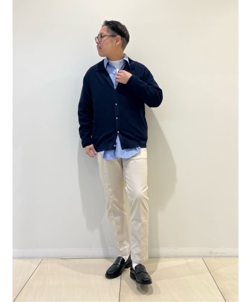 【THOMAS MASON】のシャツに、吸湿性に優れた《SERIYA Cotton》カノコカーディガンをオン。襟付きデザインを選ぶことで、カーディガン特有の柔らかさに程よい「キチンと感」をプラス。