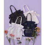 【ダブルリボンギャザートートバッグ】サテン生地にゴールドロゴをプリントしたとても上品なデザインです。サイドのリボンは縫い付け仕様なので、解けたりする心配はありません。お出かけバッグや通勤通学バッグとしてはもちろん、学生さんの体操着入れとしてもおすすめ◎