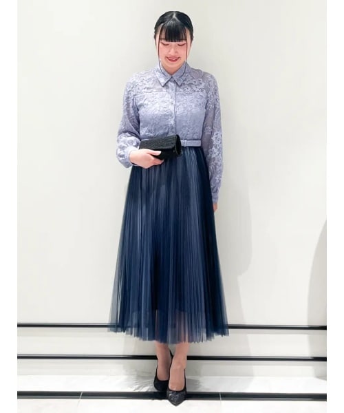 繊細ながら立体感のある上品なコードレースの上身頃に、透け感と配色感が楽しめる2種類のチュール素材でお作りしたプリーツスカートを組み合わせ、上下着合わせた様な新鮮なデザインに仕上げました。
