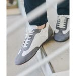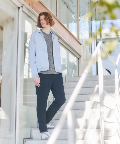 全体は春らしくニュートラルで統一しつつ、フーディの淡いブルーと白スニーカーが爽やかさを演出。