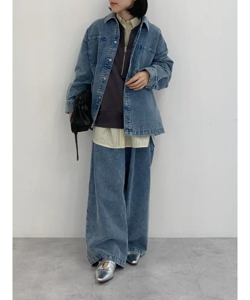 【着用サイズ トップス いずれも:F パンツ:M】シャツやパンプスなどで大人カジュアルに合わせました。デニムのセットアップは、中にスウェットやニットを着込めるので春まで大活躍間違いなしです。