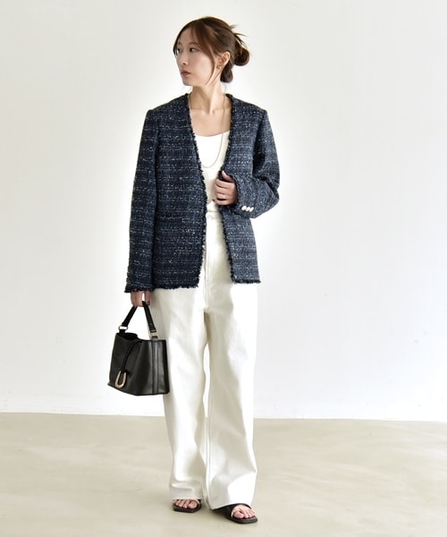 quaranciel: ツイード ノーラペル フリンジ ジャケット