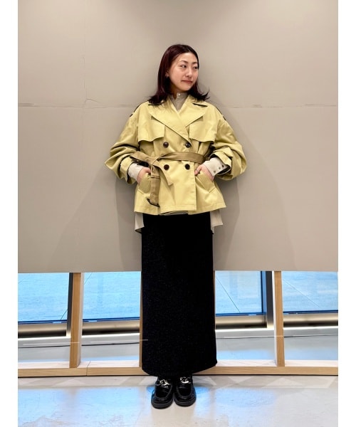 ややゆったりしたサイジングのトレンチですが、ベルトやヨークの配色で引き締め効果◎ ブラウスはボウタイを外して着用しました。首元がすっきりして様々なコーディネートとマッチするのでおすすめです。 スカートはウエストがオールゴムで着心地抜群です。