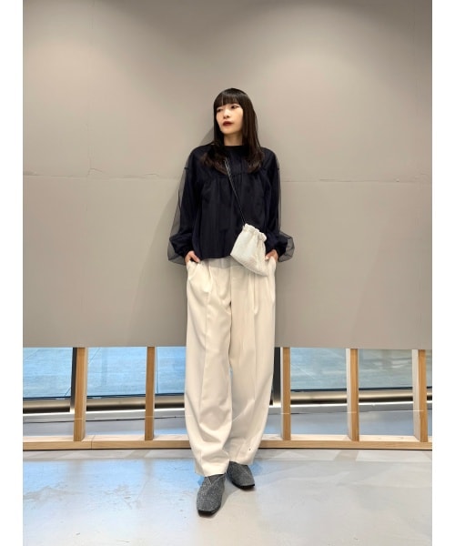 チュールトップスにスラックスを合わせて甘くなりすぎないコーデにしました。パンツは2wayで裾のボタンを留めるとよりスッキリ見えします!