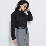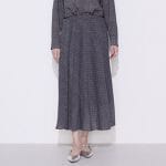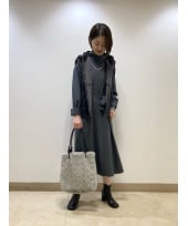 ドットプリントのボウタイシャツとスカートのセットアップの着こなしです。イエローのニットで柔らかい印象のコーディネートにしました。