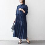 《一部追加予約》SHIPS any:〈手洗い可能〉ドット バンドカラー プリーツ ロング ワンピース