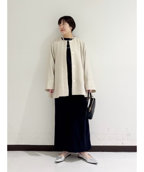 リアルバイ予定のジャケットです。 ゆったりシルエットでぽわん袖が女性らしい上品さがあります。 同素材のトップスとスカートをセットアップで着ました。 ストレッチがきいていてシワになりにくいので座りが多いセレモニーやオフィスカジュアルスタイルにオススメです。