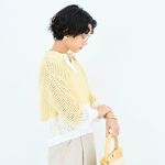 春の新作メッシュコーデのご紹介 上下で配色のメッシュニットが登場! テープヤーンのもっちりとした生地感が特徴的です ちくちくせず手洗い可能なところもグッドポイントです