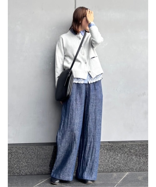 スエット風ニットのカーディガンを使用した春の大人カジュアルコーディネート。 カーディガンの裾から覗くインナーの裾スカラップ刺繍シャツが程よい甘さを演出してくれます。 ボトムはリラックスシルエットのワイドパンツを合わせラフだけどカジュアル過ぎない大人なスタイリングです。