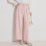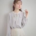 配色やリボンデザインが華やかなスタイル。 アウターには白をセレクトし、春らしい印象に。 ブラウスはインしても、ウエスト部分をブラウジングして程よいゆるシルエットで着られました。