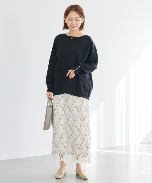 抜け感のある袖スリットデザイン。スリット上部にさりげなくあしらったパールが、程よい華やかさをプラスします。体のラインを拾いにくい、やさしいコクーンシルエットで、気になる部分を自然にカバー。背面の切り替えがアクセントとなり、どの角度から見ても美しいシルエットを演出します。