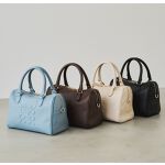 モノグラムレザーボストンバッグ。 ニットジャケットと合わせて春コーディネート。ブルーのシャツでリンクさせて爽やかな春コーデ。