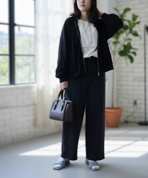 胸元のフレアが女性らしいブラウスに、カーディガン感覚で羽織るブルゾン、ダークグレーのデニムワイドで締めたモノトーンの春コーデ。クールでシックな中に程よい抜け感があり、キレイカジの大人の定番スタイルです。小物の色で表情を変えやすく、春らしい軽さのあるコーディネートです。