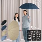 風に強く美しいフォルムが魅力の16本骨傘。 直径102cmと大きめサイズで広範囲をカバー。上品なデザインで男女問わずお使いいただけます。