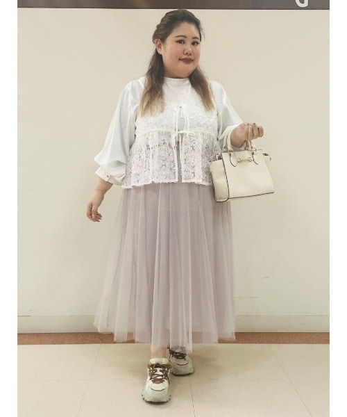 コラボアイテムのレースリボンビスチェを主役にしたコーディネート♪ 同色のブラウスと合わせ、チュールスカートでふんわりとしたフェミニンさをプラスしました! レースビスチェが、上品で可愛らしい印象を引き立てるアクセントになります^ ^