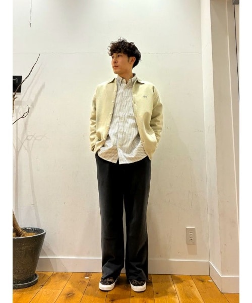 中に落ち着いたストライプシャツを着ています!ゆったりとしたシルエットでこのシャツ一枚でも色々なコーデを組む事が出来ます!その上に春色のカーディガンを着ています! その下に切りっぱなしになっているスウェットパンツを履いています!